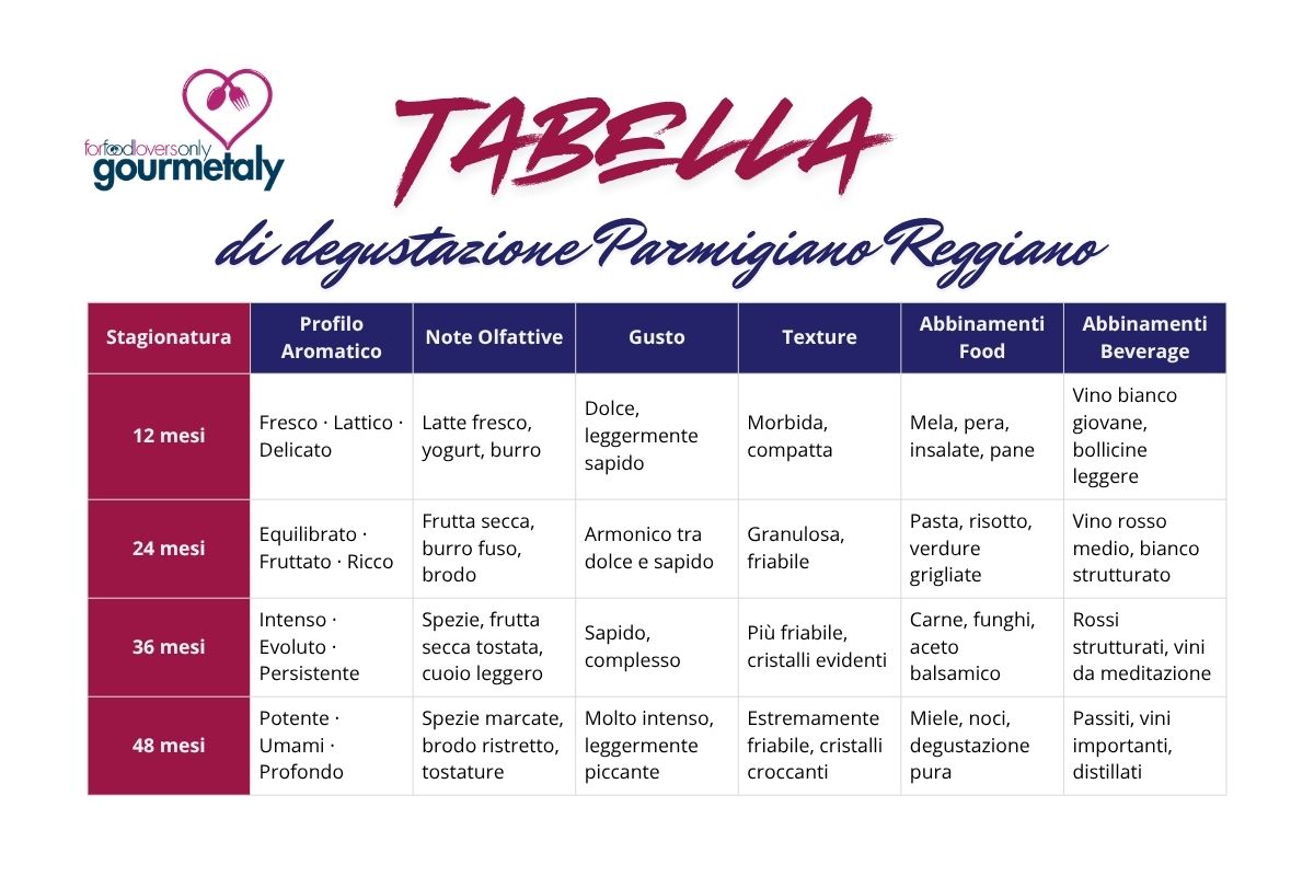 Guarda come cambiano i profili aromatici del Parmigiano con la stagionatura. Lasciati guidare dalla nostra tabella di degustazione